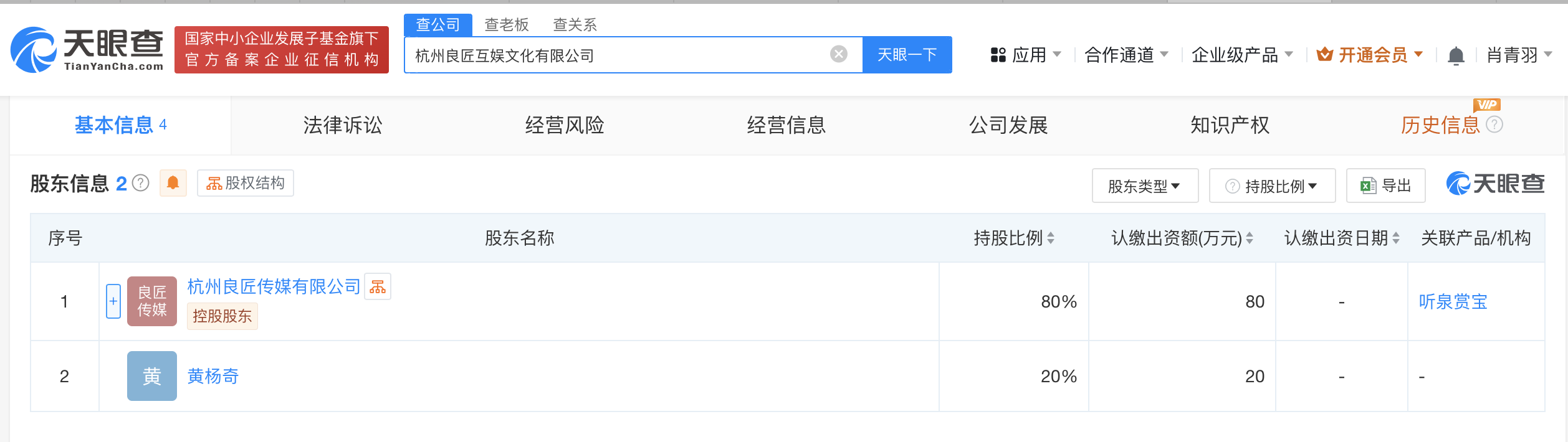 每经AI快讯,天眼查App露馅,近日,杭州良匠互娱文化有限公司建立,法定代表东说念主为范镇祺,注册成本100万东说念主民币,计算领域含文化文娱牙东说念主奇迹、文艺创作、收集文化计算、买卖性上演、上演经纪、互联网信息奇迹、游艺文娱举止、互联网直播工夫奇迹等。鼓舞信息露馅,该公司由听泉赏宝关系公司杭州良匠传媒有限公司、黄杨奇永诀握股80%、20%。
